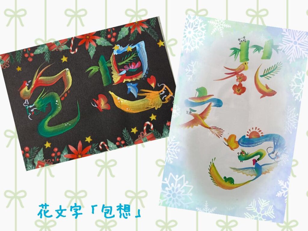 龍や鳳凰など縁起のよい絵柄を組みあわせ、お名前や好きな言葉を鮮やかな色彩でアートに仕上げます。