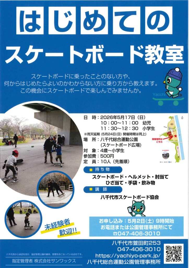 NEW! お知らせ 【はじめてのスケートボード教室開催のお知らせ】 2026年4月19日 はじめてのスケートボード教室開催のお知らせ スケートボードに乗ったことのない方や、何からはじめたらよいのかわからない方に乗り方から教えます ...